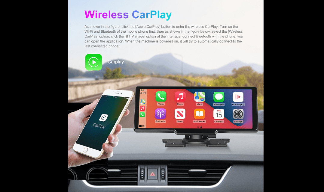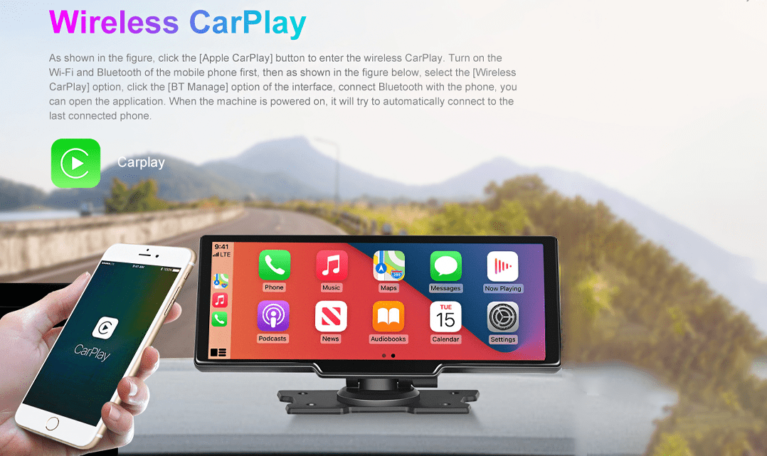 ????【Trådløs Apple CarPlay】 Med trådløs Apple CarPlay kan du koble telefonen til spilleren trådløst, noe som blir en praktisk opplevelse. Du kan enkelt sette deg i bilen og din iPhone kobles automatisk til spilleren etter at denne har blitt paret. Med trådløs CarPlay kan du få tilgang til iPhones apper, kart og andre funksjoner direkte gjennom denne Spilleren, samt bruke Siris voice command for å kontrollere Spilleren.