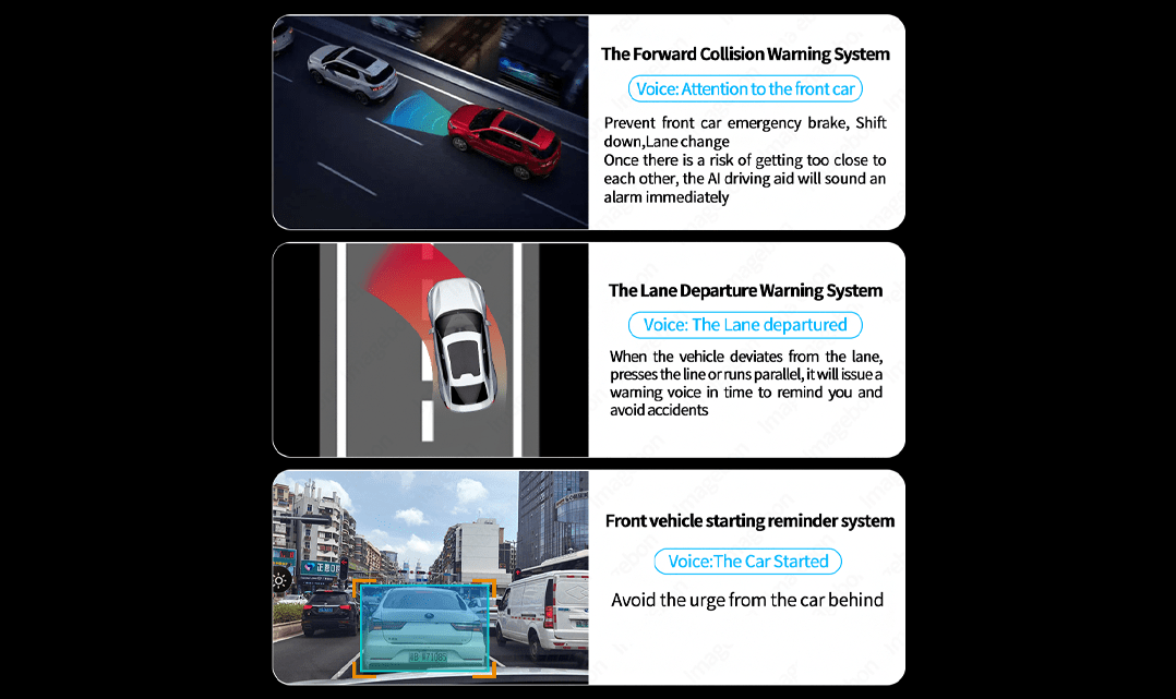 Gjør kjøring tryggere Avanserte kjørealarmsystemer (LDWS/FCWS/FVDW), det nyttige alarmsystemet for å gjøre kjøringen tryggere. Lane Departure Warning System (LDWS) Døsig eller distrahert kjøring øker risikoen for en ulykke på veien betydelig. LDWS vil advare sjåføren når kjøretøyet kjører ut av kjørefeltet med en hastighet over 50 km/t. Forward Collision Warning System (FCWS) Ulykker kan unngås ved å holde en sikker sikkerhetsavstand til bilen foran. Trafikksikkerhetsvarslingssystem i speilet beregner sanntidsavstanden mellom kjøretøyet ditt og kjøretøyet foran deg, når du kjører over 30 km/t på motorveier eller under 30 km/t i en travel by, en 3-trinns tidlig advarsel gis til føreren avhengig av faren for kollisjon. Front Vehicle Departure Warning (FVDW) Når bilen din stopper i et veikryss eller i trafikken, informerer det intelligente veiledningssystemet deg om at kjøretøyet foran har begynt å bevege seg, og forhindrer en forsinket reaksjon hvis du slutter å se fremover.