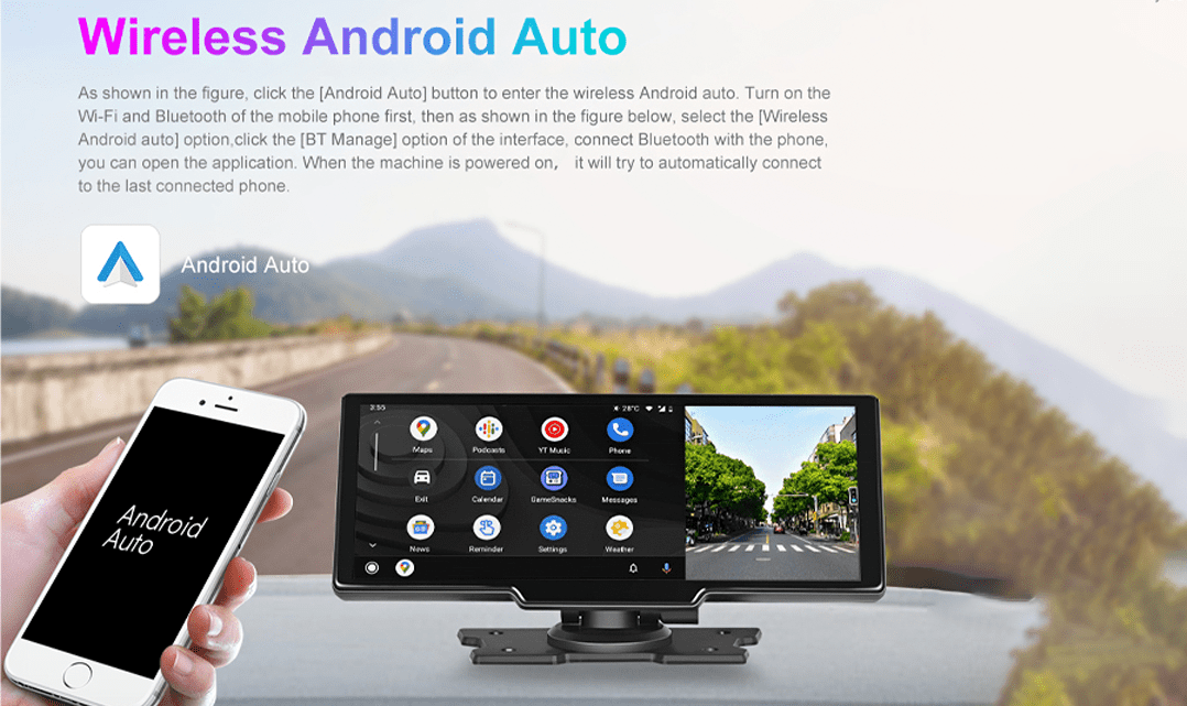 ????【Trådløs Android Auto】 Android Auto gjør det slik at Android-telefon få tilgang til telefonens funksjoner via Spilleren. I likhet med CarPlay kan Android Auto nås via spillerens touchskjerm eller via voice commands. Mens Android Auto i utgangspunktet krevde en kablet tilkobling til bilens system, støtter nyere telefoner og bilmodeller nå også trådløs Android Auto. (MERK: Trådløs Android Auto er kun kompatibel med Android 11.0 og nyere)